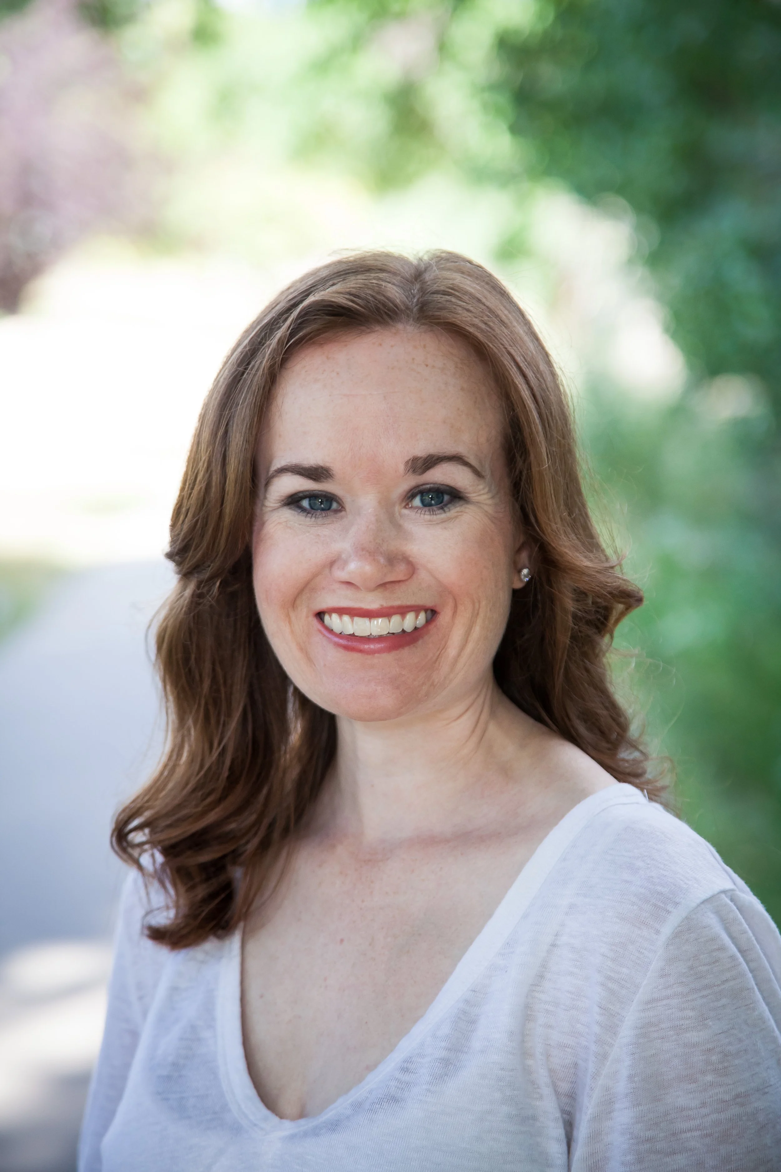 A photo of Amelia in front of a natural green backdrop, with red hair, and smiling